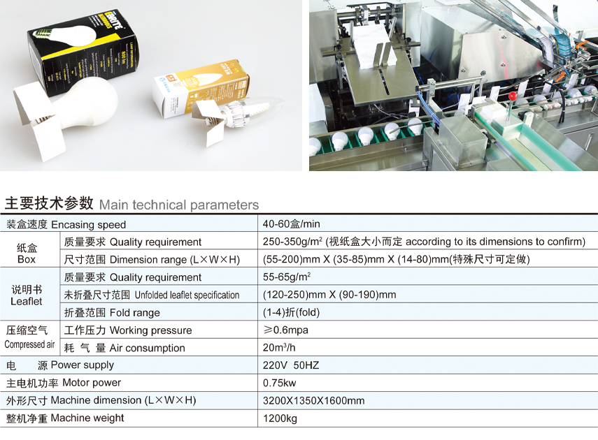 本產(chǎn)品是我公司結(jié)合國(guó)外包裝機(jī)的先進(jìn)技術(shù)及根據(jù)目前照明、電子等行業(yè)的實(shí)際情況而研發(fā)的具有新型、先進(jìn)的包裝機(jī)械設(shè)備,是機(jī)、電、氣、光一體化的高科技產(chǎn)品。本產(chǎn)品適用于照明、電子等行業(yè)各類(lèi)球泡燈、蠟燭(尾)燈、筒燈、射燈、單端熒光燈、節(jié)能燈、鎮(zhèn)流器等等以及相類(lèi)似物品的裝盒包裝。該機(jī)還具有自動(dòng)完成使用說(shuō)明書(shū)的折疊、紙盒自動(dòng)打開(kāi)、單邊內(nèi)村自動(dòng)上料、物品帶內(nèi)襯和說(shuō)明書(shū)-起自動(dòng)裝盒、封盒等功能。同時(shí)也是解決目前招工難、管理難而代替勞動(dòng)力的先進(jìn)自動(dòng)包裝設(shè)備。該機(jī)可以單獨(dú)使用亦可以與其他設(shè)備聯(lián)動(dòng)使用,形成成套生產(chǎn)聯(lián)動(dòng)線。