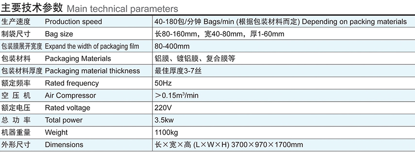 本產品是根據國內制藥行業的實際情況而研發的擁有新型、具有先進的高速往復式枕式包裝機,同時也提高了鋁塑藥版的防潮性能。該機采用PLC可編程控制器,使整機運行程序化,往復式端封機構,封口牢固,封膜切刀無損,帶有端封插角裝置,使袋形更美觀,提高產品檔次,節約包裝成本;本機并配有自動打碼機能在包材上打生產批號、生產日期、有效期等。